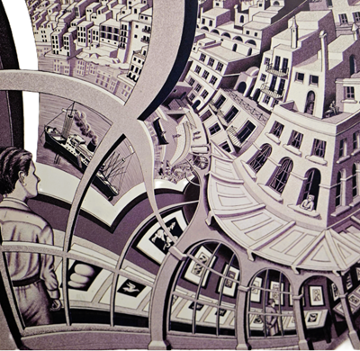 « La Galerie d'estampes » représente un homme contemplant, dans une galerie d'art, une estampe représentant un port. Parmi les bâtiments du port figure la galerie même où il se trouve, exploitant ainsi l'effet Droste et la récursivité visuelle. Cette lithographie a suscité des discussions tant dans le domaine mathématique qu'artistique. Escher considérait La Galerie d'estampes comme l'une de ses meilleures œuvres. La signature d'Escher figure dans un espace circulaire vide au centre de l'œuvre, lieu du point singulier de la transformation. En 2003, deux mathématiciens néerlandais, Bart de Smit et Hendrik Lenstra, ont proposé une méthode pour combler cet espace en considérant l'œuvre comme dessinée sur une courbe elliptique du corps des nombres complexes. Lorsqu'une idée, fondée sur un modèle, est représentée, même si son application est uniquement partielle, cette représentation remplit déjà sa fonction. Par la suite, lorsque les techniques le permettent, le modèle continue d'être transmis. Les éléments essentiels pour la transmission d'une idée sont la modélisation et la représentation. Si, de surcroît, la représentation revêt une dimension esthétique, sa durée de vie est prolongée. |